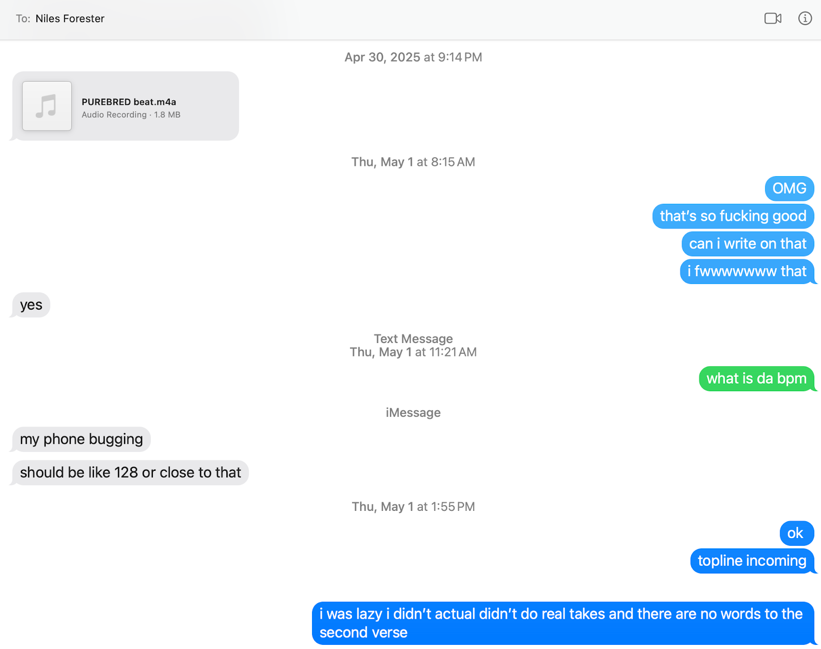 Over the course of our relationship, Niles sent me a lot of instrumentals that I believed to be original creations. When Niles sent me these two instrumentals, I had absolutely no knowledge that you wrote on top of these prior. He didn’t tell me. For my album HALO, most of the songs that we made together were from scratch in the studio. Niles had also sent me instrumentals, it is a way that we work together when we are not physically together. Screenshots below: