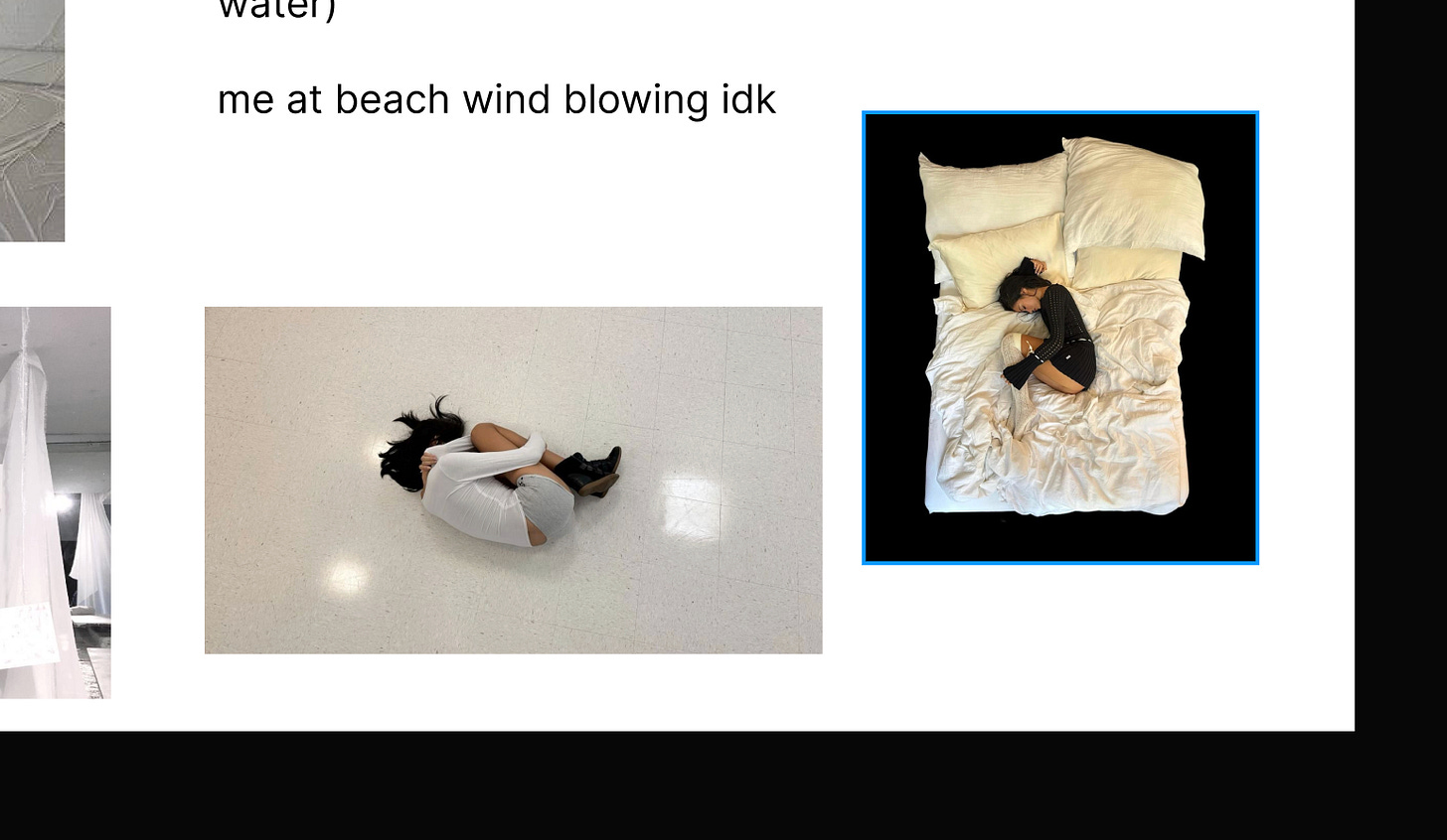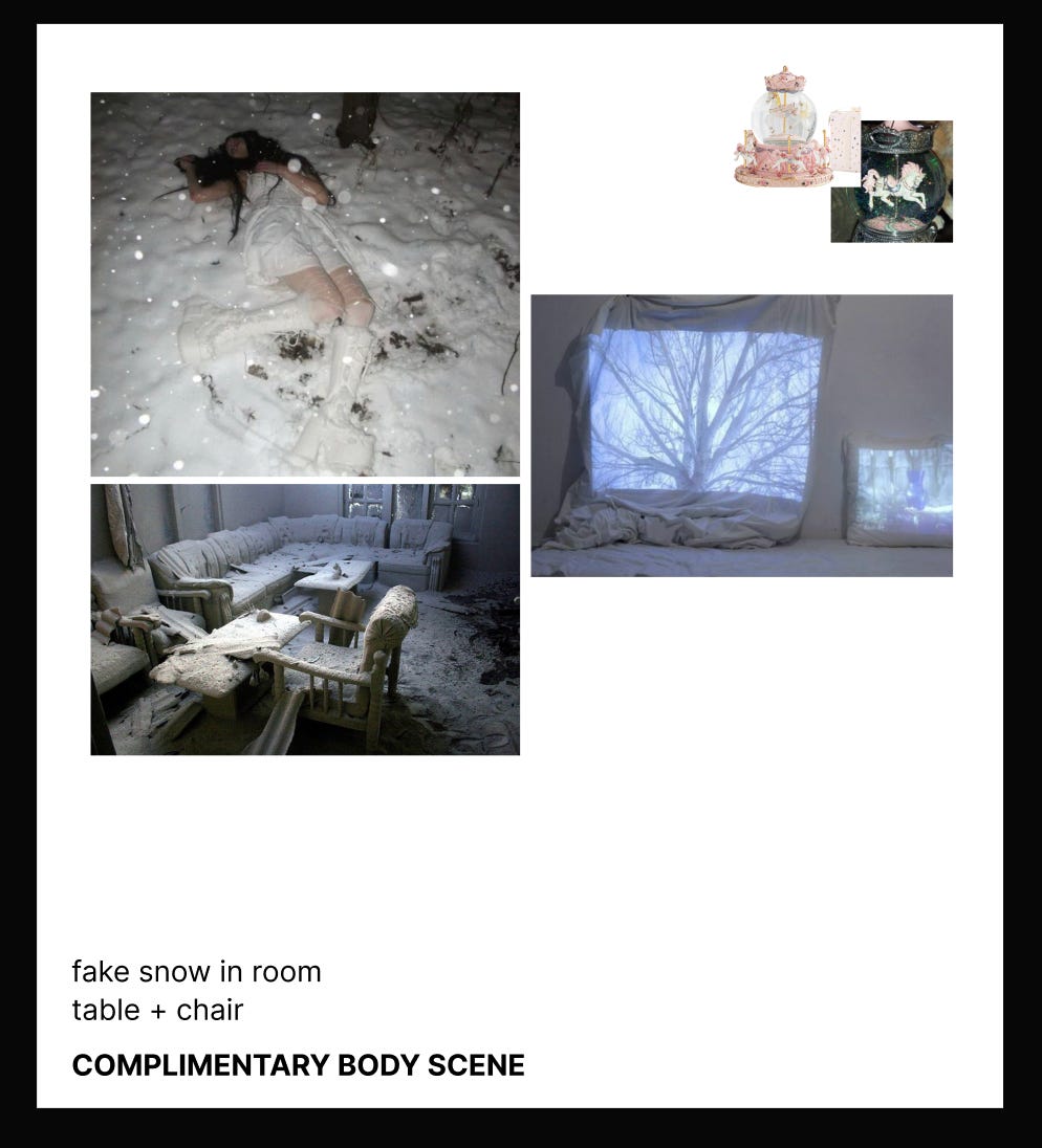 You claim I stole your concept of lying on the ground with snow. With respect Fawn, I don’t think you invented lying on the ground with snow. I’ve got receipts that show every single reference photo Ally and I have ever pulled for the visual world of this song attached below.