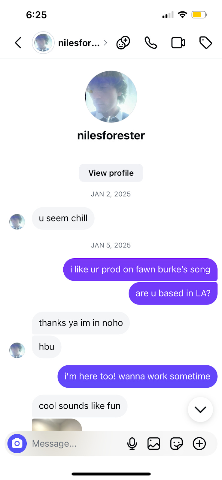 I met Niles in early 2025, I reached out to him through Instagram DMs after I had heard his production on one of your songs that I found through Tik Tok. Yes- I discovered him through your song, but often, that is how producers are found, you like other songs that they’ve made. I wasn’t trying to recreate anyone’s music- a lot of producers that I work with to this day have produced songs that I also enjoy. Here is a screenshot of me doing just that: