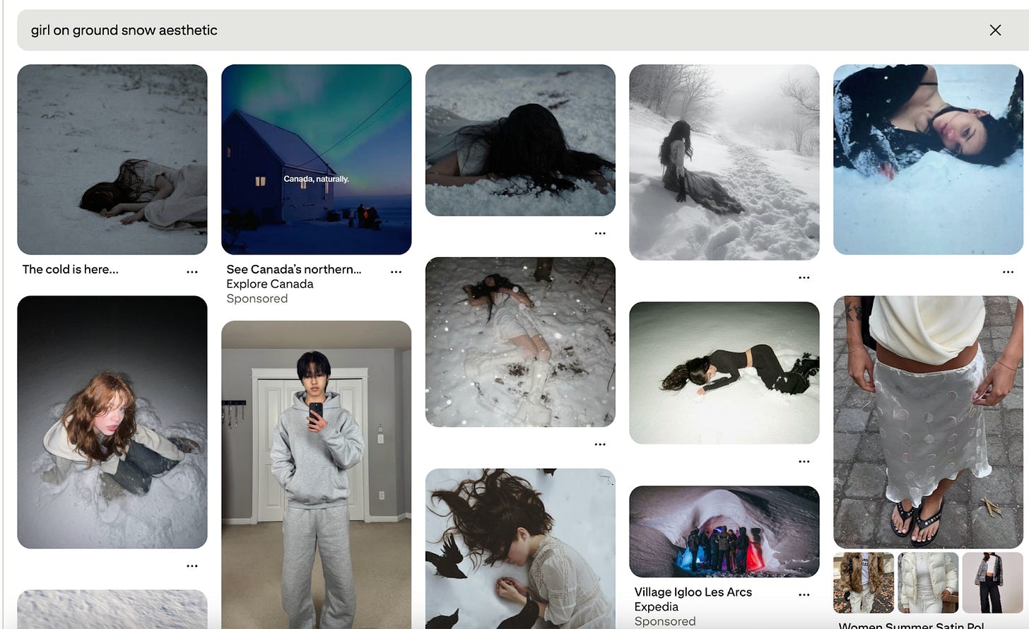 The reference photo is literally just another picture of a girl (that is NOT you) lying in snow. How are you going to trademark lying on the ground when there are a crazy amount of photos of girls lying on the ground in snow? As soon as you type in “girl on ground snow aesthetic” which I did for my inspiration, there are just countless photos on Pinterest. See below.